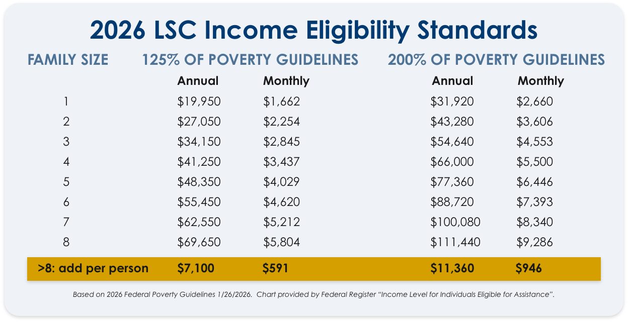 If you are under 60 years of age, and do not have a domestic violence issue, or fall under a special grant, as a general rule, our financial eligibility is based on the federal poverty levels, and ALSC may require proof of income prior to delivering legal assistance. ALSC provides legal assistance to eligible clients depending upon the requirements of specific grants.