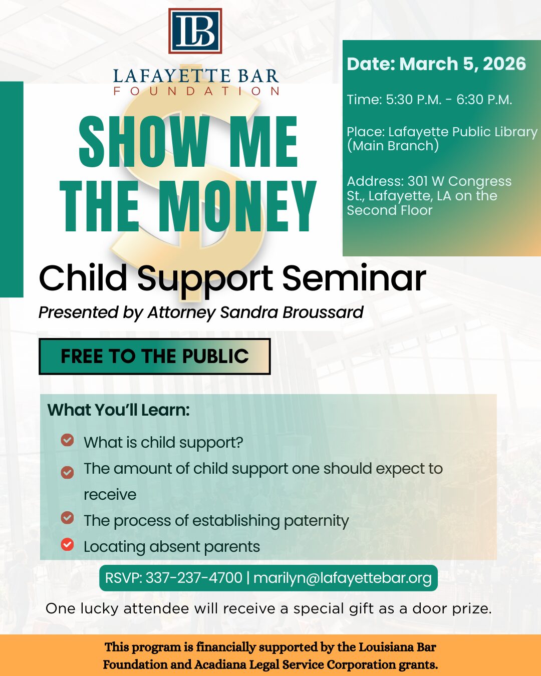 The Lafayette Bar Foundation is hosting Attorney Sandra Broussard for a child support Seminar on March 5, 2026. This event is FREE to the public. You will learn about child support, the process of establishing paternity, and locating absent parents.