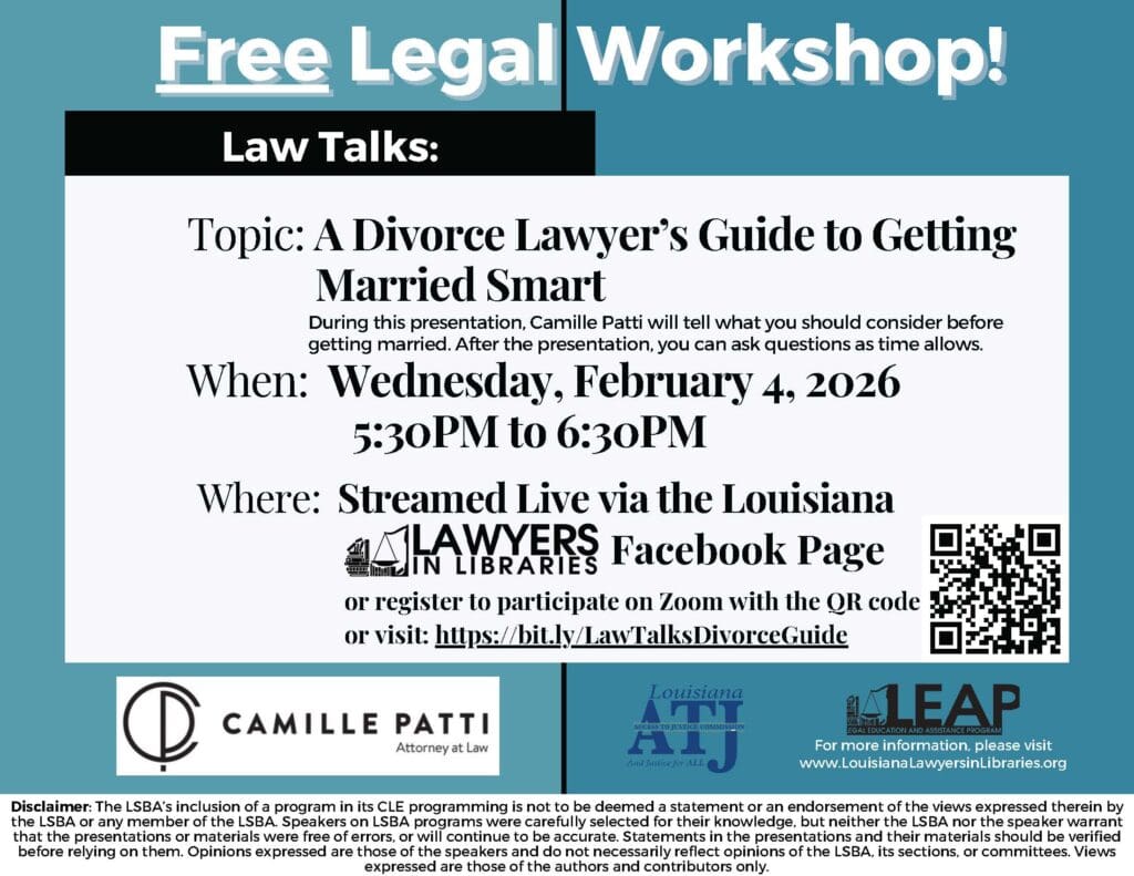 These are hosted by LEAP | Louisiana Lawyers in Libraries and the Louisiana Access to Justice Commission.
