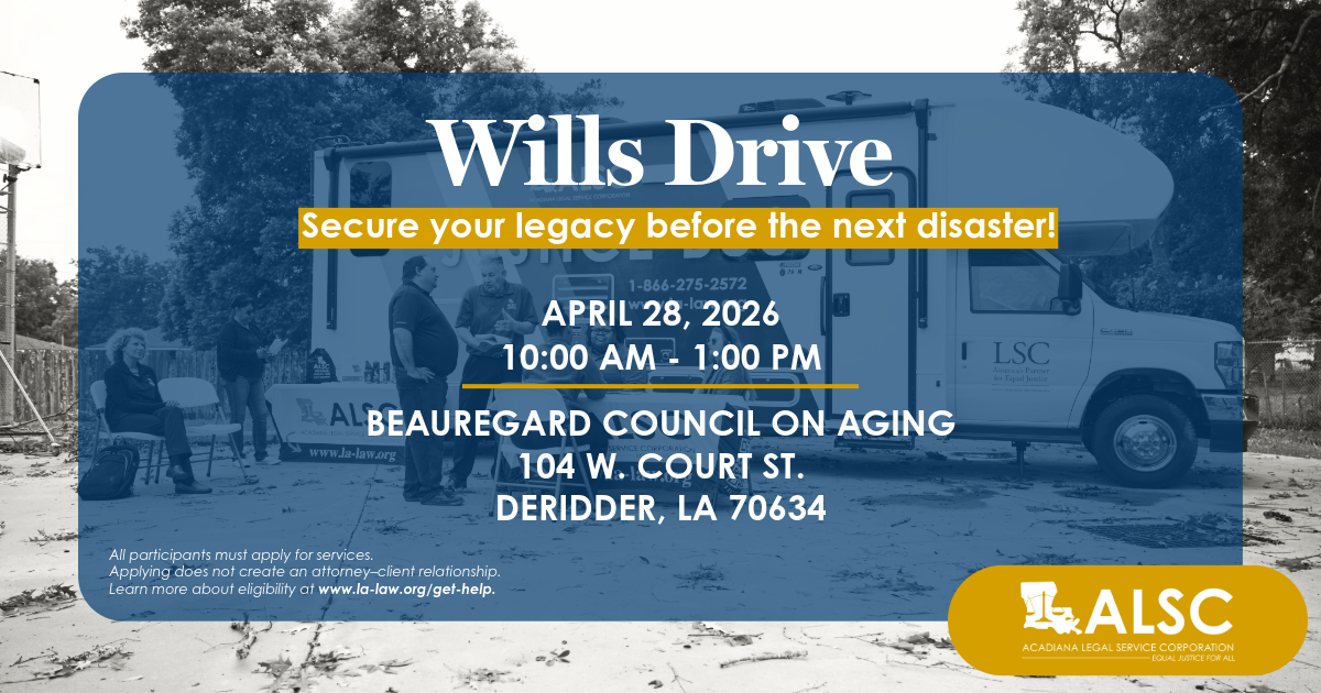 Join us for a Wills Drive at the Beauregard Council on Aging on April 28, 2026, from 10:00 AM to 1:00 PM. Secure your legacy before the next disaster!  Disclaimer: All participants must apply for services. Applying does not create an attorney-client relationship. Learn more about eligibility at www.la-law.org/get-help.
