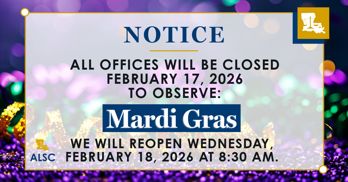 🎉 All offices will be closed on February 17, 2026, to celebrate the vibrant spirit of Mardi Gras! 💜 💚 💛 We'll be back and ready to assist you on Wednesday, February 18, 2026, at 8:30 am. 💜 💚 💛
