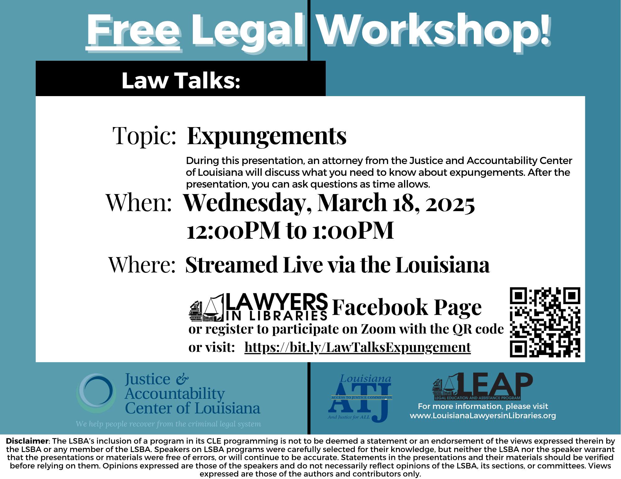 During this presentation, an attorney from the Justice and Accountability Center of Louisiana will discuss what you need to know about expungements. After the presentation, you can ask questions as… |